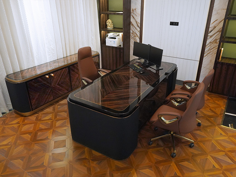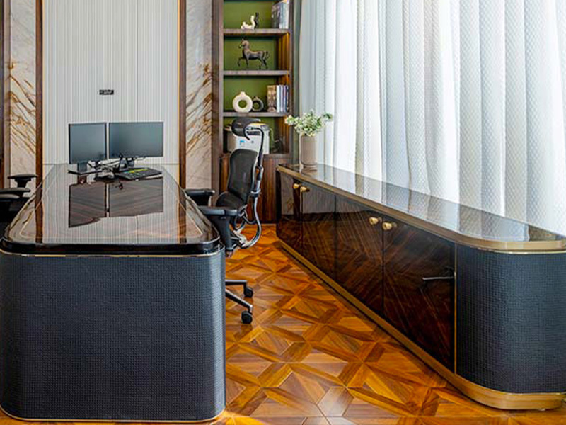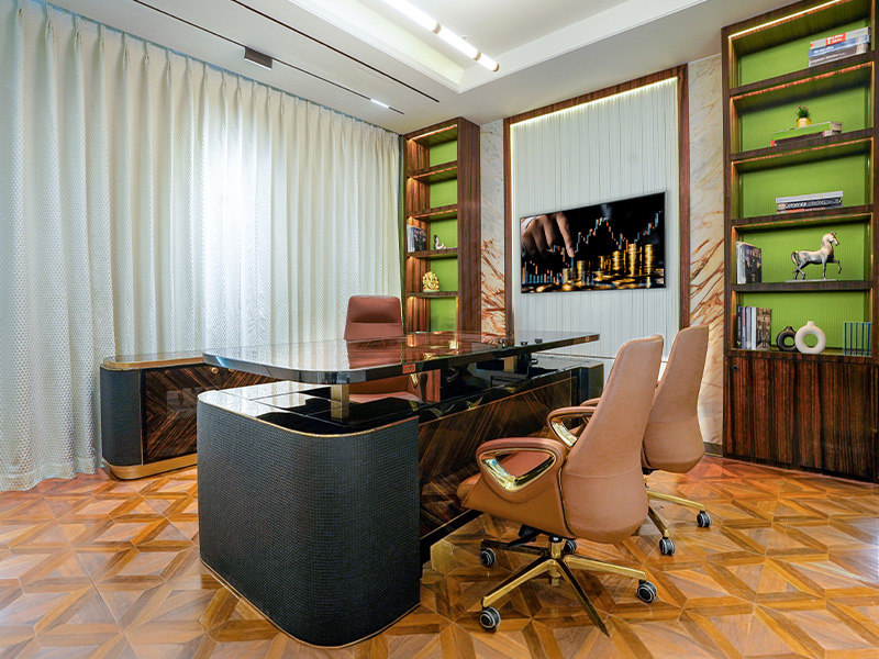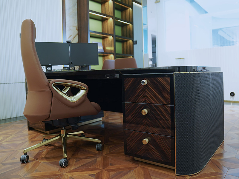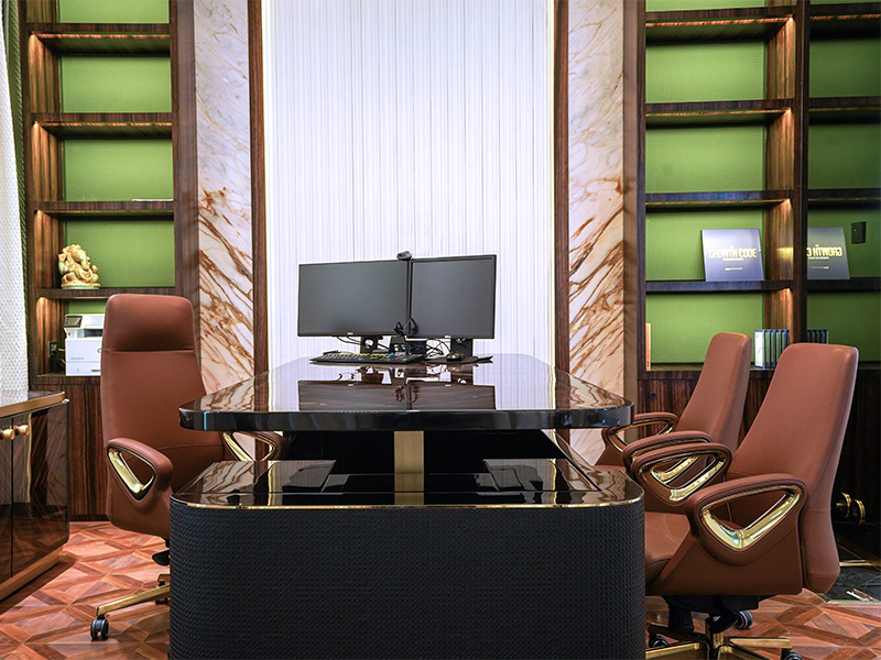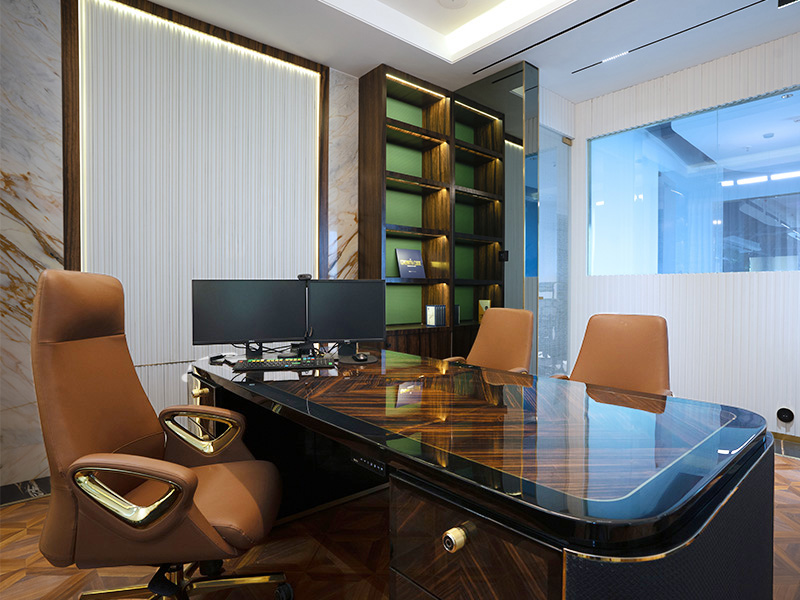 The Philippe Senior Management Luxury Cabin Collection comprises of the Senior Management Desk, Side Runner, a Back Credenza, Conference and Meeting Tables, Library and Storage unit along with a Coat Hanger, T.V. Panel and a beautiful Planter to enhance the overall aesthetic. This contemporary modern office is a masterful design concept with auto-uplifting tables, Finger Scan Locks and a luxurious matte finish.