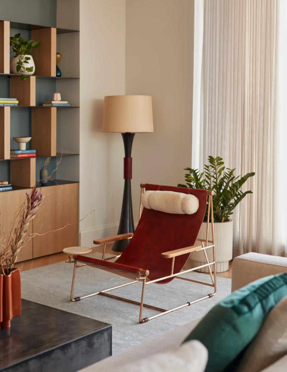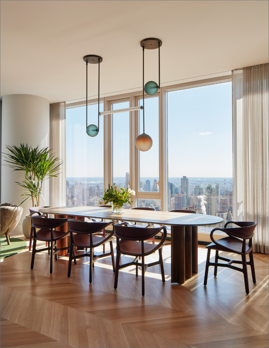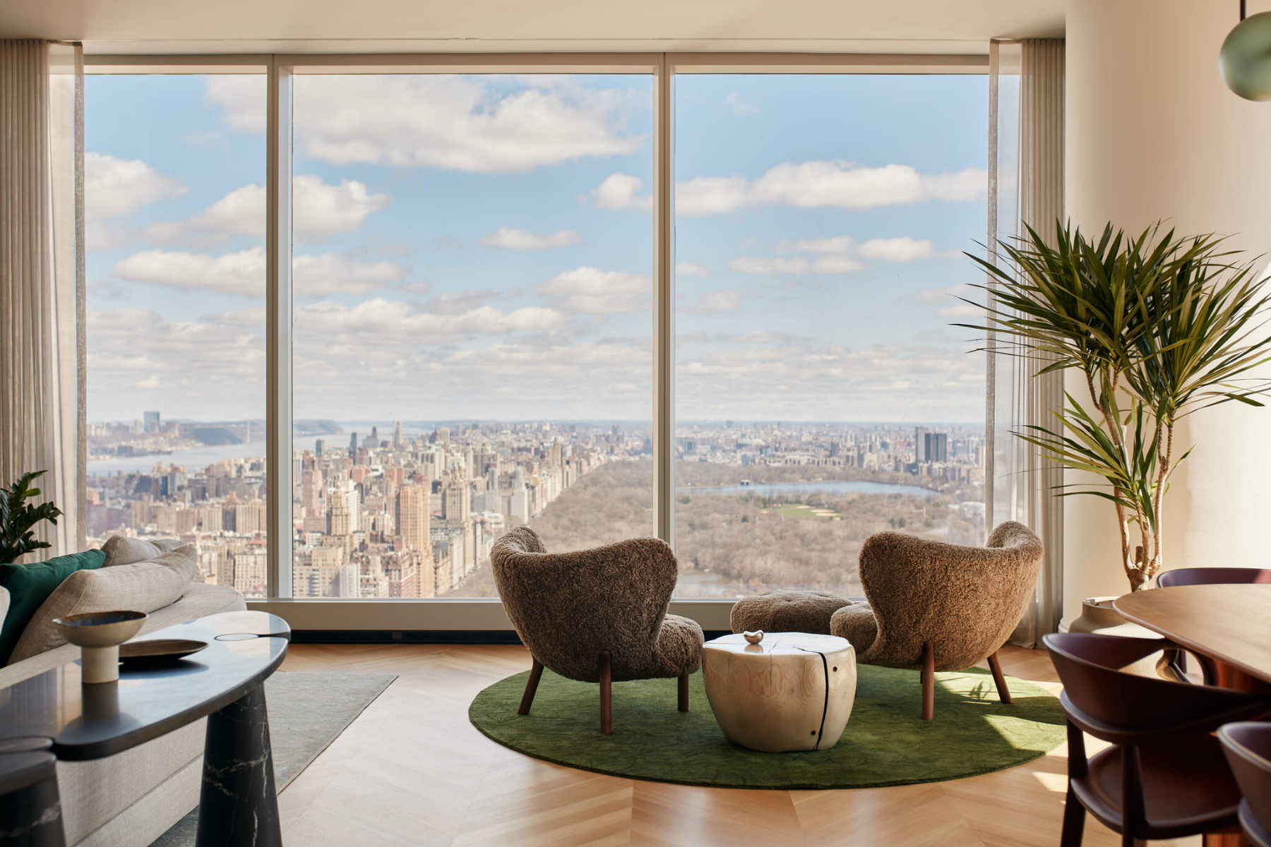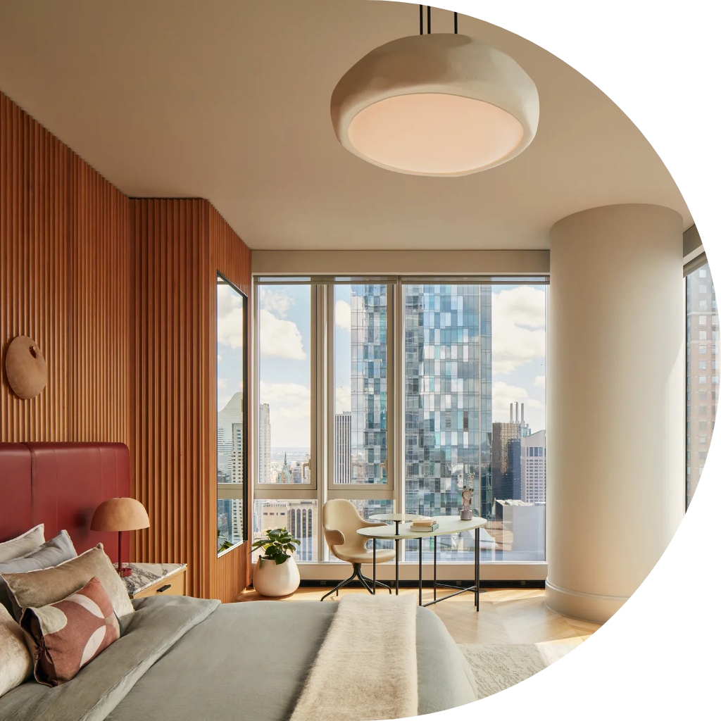 At this elevated luxury apartment, the expansive view of Central Park is breathtaking but can feel overwhelming. DF&A's challenge was to introduce a sense of human scale into this glass-and-steel aerie, balancing the grandeur of the views with the intimacy of home.To address this, DF&A designed a custom mill piece that incorporates backlighting, texture, and depth to soften the living room's striking vista. For the bedroom, DF&A clad the non-window walls in scalloped wood, creating a handcrafted warmth. The space is transformed with custom furnishings, including a supple red leather headboard with integrated nightstands, mirrors, and ceramic lamps, turning the glass-sided box into a cozy retreat.