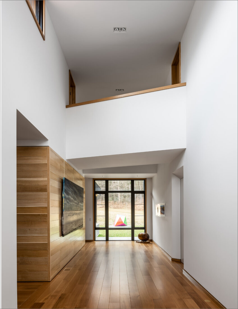 Nestled in a woodland clearing at the foot of the Berkshire Mountains, this contemporary farmhouse serves as a gathering place for three generations of one family. Designed for a semi-retired couple, the home comfortably accommodates extended family and showcases their art collection.The interior layout includes intimate spaces for daily living and larger areas for family gatherings, with a dedicated playroom for children and a stargazing tower accessed via a bridge over a double-height gallery. A retractable skylight opens to the night sky, where a telescope invites exploration of celestial wonders.