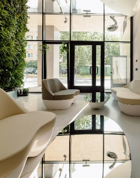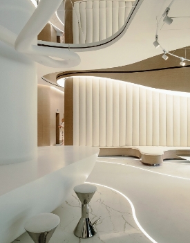 The condominium boasts an impressive 295 units within a sprawling total building area of 408,888 square feet. Committed to sustainability, Karim's designs adhere to stringent green standards, seamlessly integrating recycled terrazzo flooring, low-VOC carpeting, zero-VOC paint, and reclaimed wood veneer wall panels. The design embodies a progressive aesthetic, featuring dynamic forms that are harmoniously enhanced by a warm and inviting colour palette.