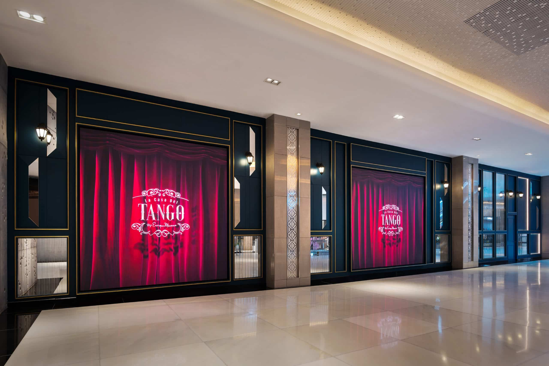 Additionally, embossed wallpaper on sliding panels serves as a flexible divider between the stage and dining area, enabling private classes without disrupting the restaurant's flow. Two large interactive screens on the mall's side invite pedestrians to engage with tango dance patterns, adding an inviting touch to the façade.