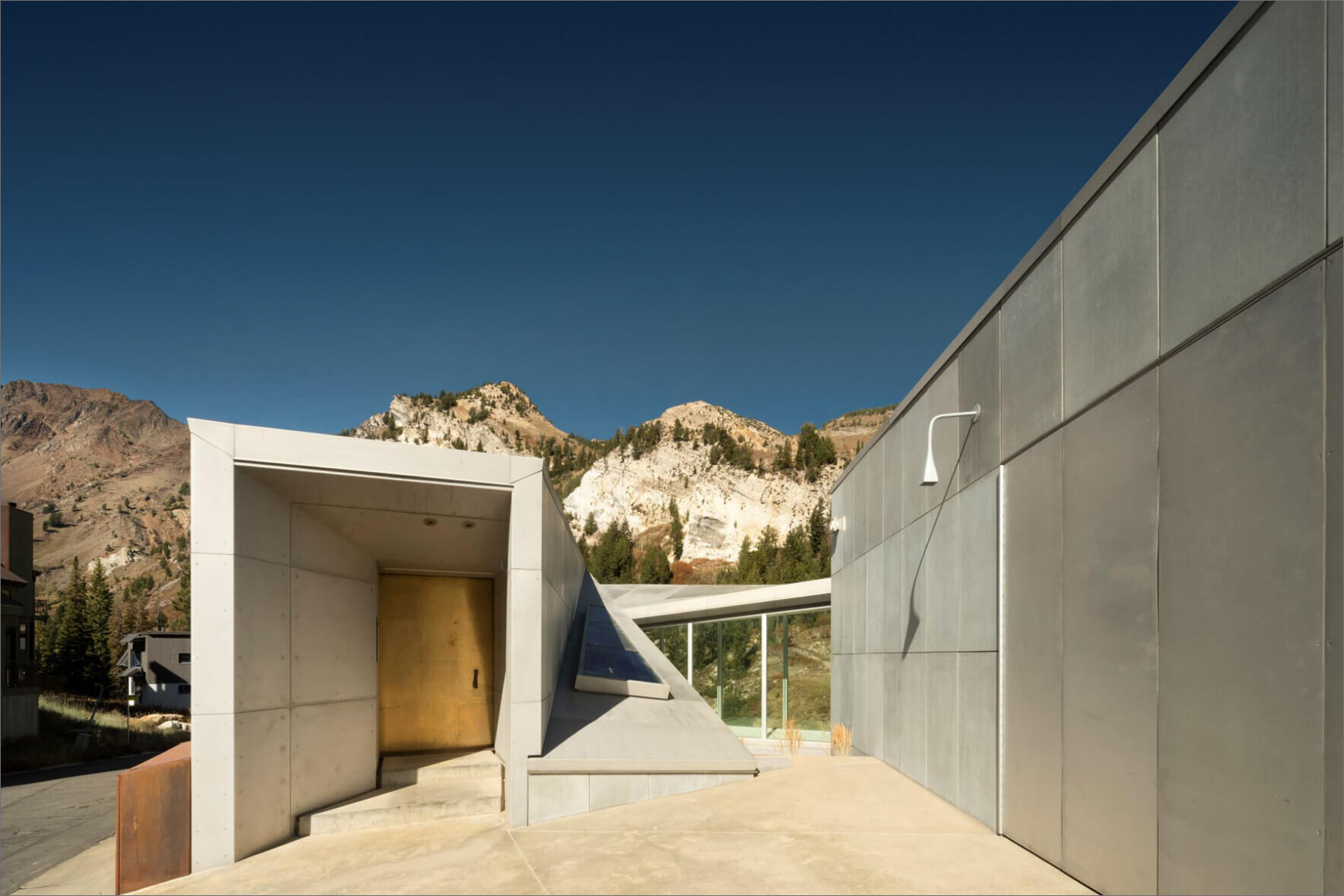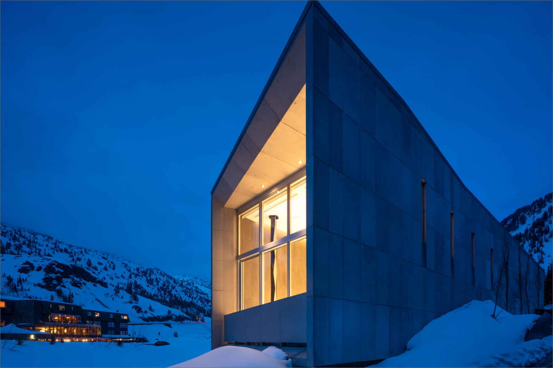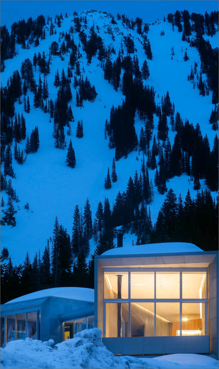 Alta, a small ski town near Salt Lake City, is renowned for its extreme snowfall, averaging over 40 feet annually. At 8,500 feet, it offers an ideal setting for a winter retreat, attracting a New York client seeking a thoughtfully designed ski house by DHD. The house features two concrete forms, “tube” and “crystal,” connected by a glass bridge, cleverly offset to enhance views of the surrounding mountains. The solid facade faces the street, while expansive windows in the living area and music room frame stunning alpine vistas. Constructed primarily of concrete, the design incorporates custom mixes to withstand harsh conditions, resulting in a five-year build due to winter constraints. The serene interior showcases a collection of 20th and 21st-century architectural pieces against a backdrop of textural concrete walls, Douglas Fir accents, and a striking wood-burning stove, creating a harmonious blend of artistry and nature.