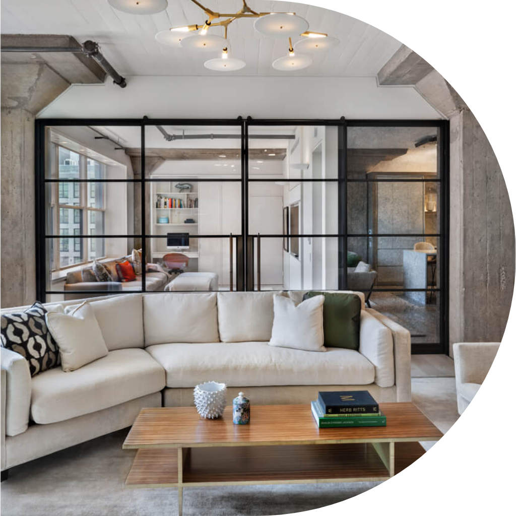 The design divides the space into private and public areas, separated by an entrance gallery. In the public spaces, the concrete ceiling remains exposed, and the massive industrial columns have been sandblasted to reveal their raw beauty. In the private areas, columns are painted, and the ceilings are slightly lowered, with raised white oak floors on a platform to accommodate new light fixtures and plumbing.