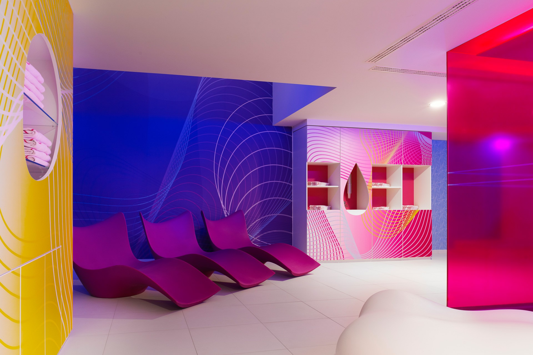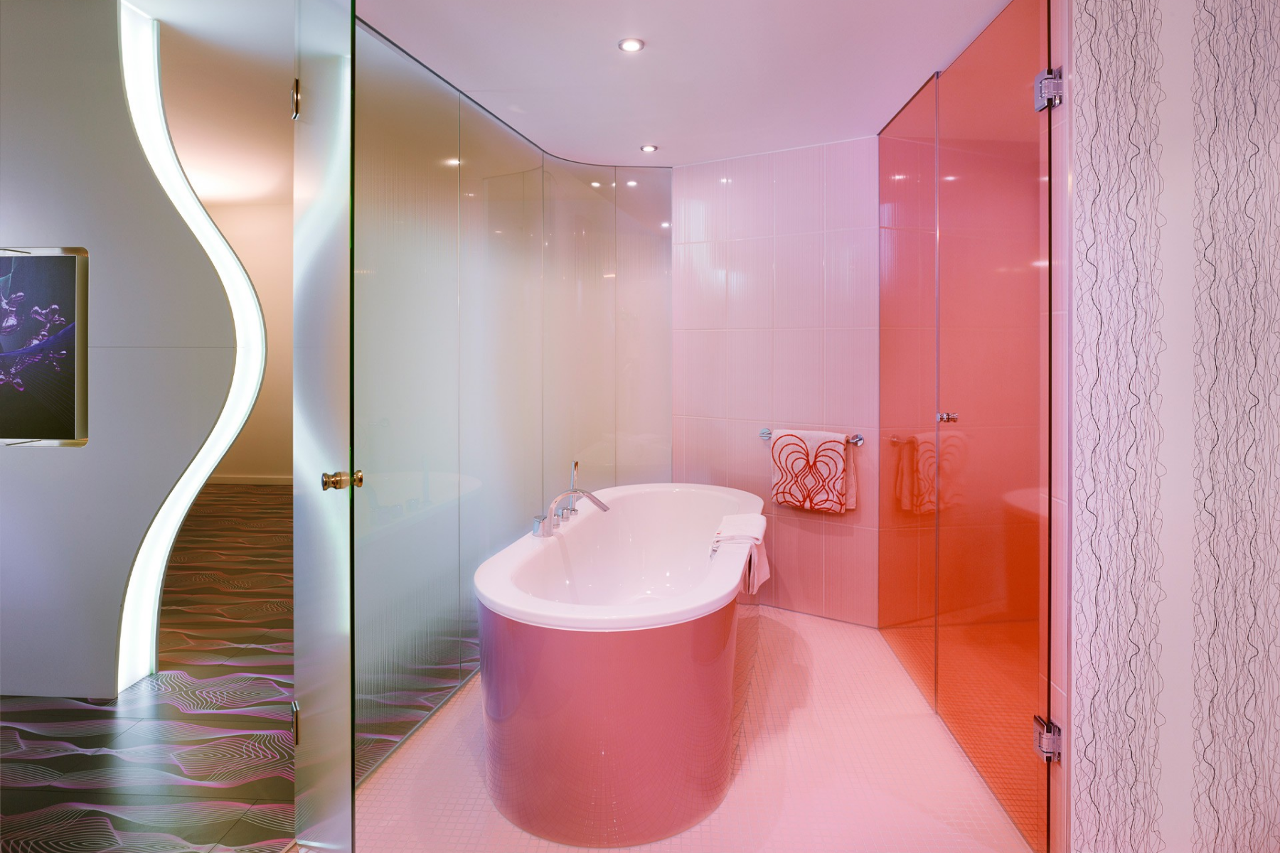 The East Tower features warm gold and fuchsia hues, while the West Tower's Technolux rooms showcase cooler tones of grey, blue, and pale pink. The Upper Towers offer serene views of the Spree, creating a perfect retreat for business travelers. With 304 guest rooms, conference facilities, a recording studio, a restaurant, a bar/lounge, and a wellness center, the nhow hotel redefines urban hospitality.