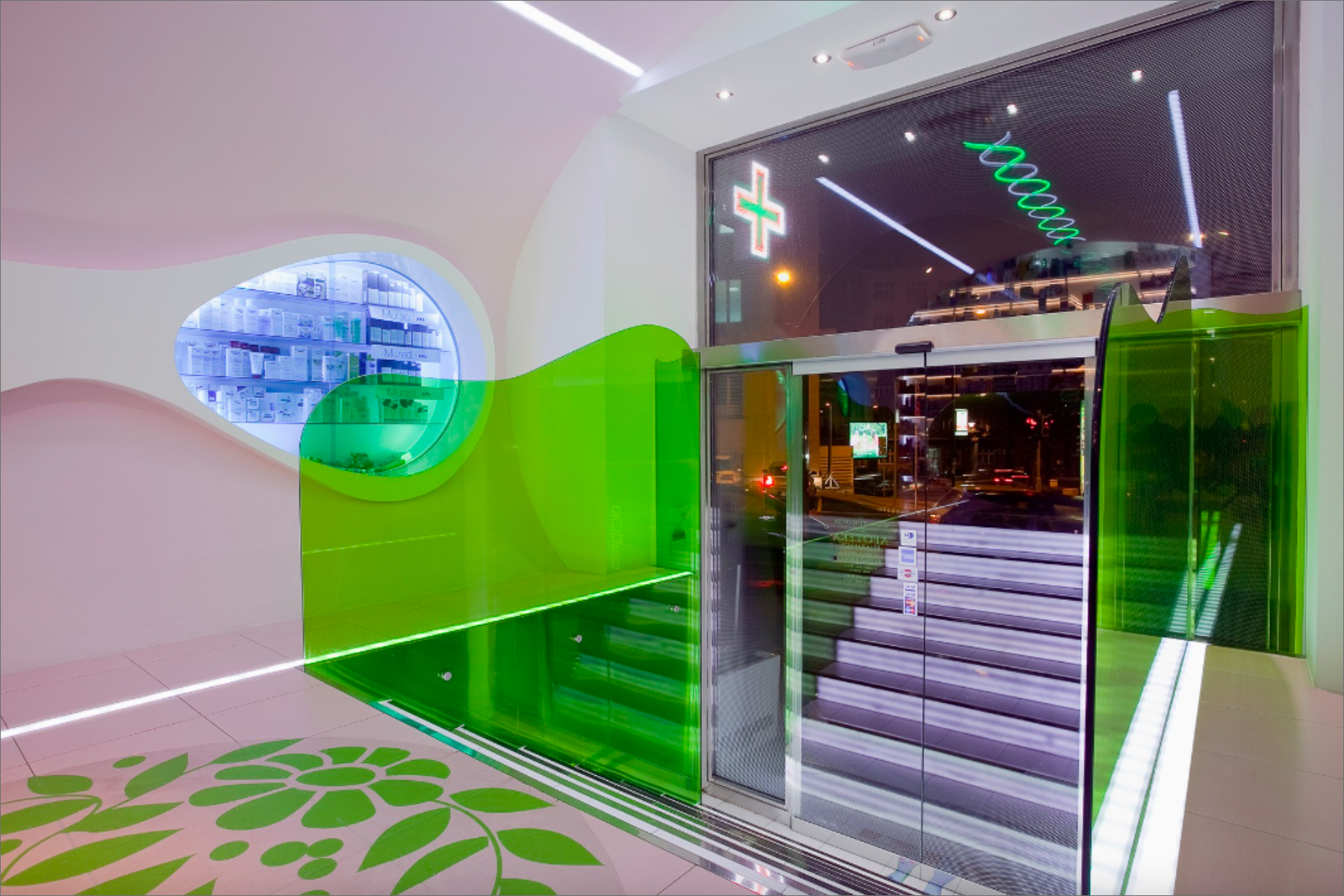 The architectural design of the Oaza Zdravlja Pharmacy draws inspiration from the intricate beauty of the human body and the healing process. Soft, flowing walls and organic shapes create an immediate sense of comfort and security. Framed by the graceful curves, a simple yet striking counter appears to hover above the ground, symbolizing the journey medication takes through the body’s cellular framework. This organic counter not only represents healing but also serves as the focal point for providing essential medicinal support.