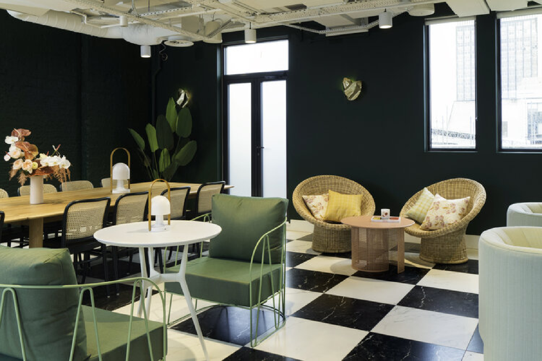 Serving as the first international flagship Wing location, the office space features multiple co-working spaces, conference rooms, quiet rooms, two full restaurants, a yoga facility, a spa bathroom, a custom pump room for new mothers, and a beauty room. Subtle elements of British design are woven throughout, ensuring each floor feels unique while remaining cohesive and on-brand.