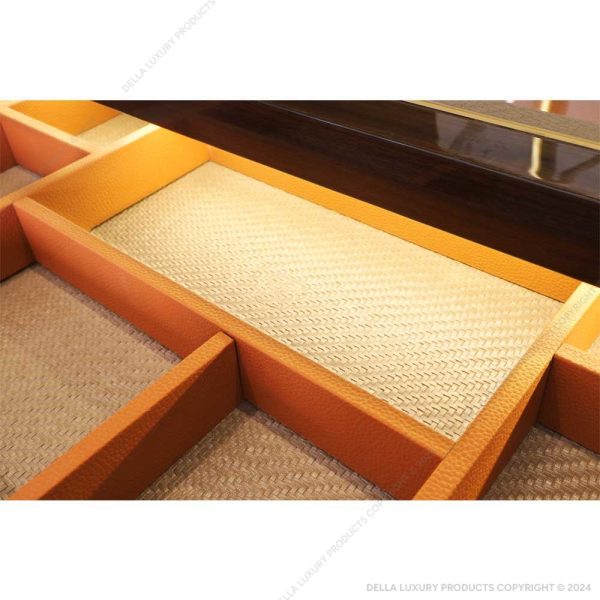 Bring an effortless style to your interiors with Gira Collection. Made in high quality Teakwood, Marine Plywood, Multi-Density Foam, Leatherite, Golden Portoro Marble, Tempered Glass and finished in High-Gloss Maccasar Ebony and American Walnut Veneer and Brushed Gold Steel.