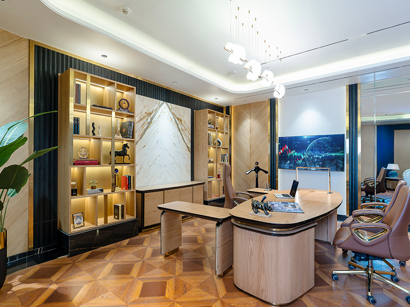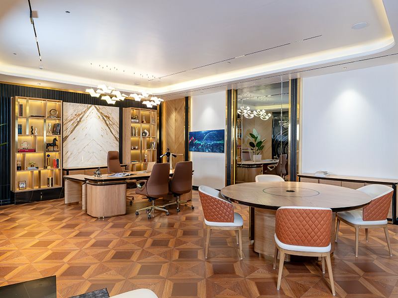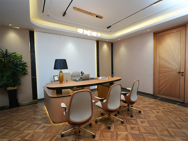 The Boran Luxury Office Cabin Collection comprises of a Senior Management Desk (M, L, XL), Side Runner, Back Credenza, complementing Meeting and Conference Tables, Library, Storage units, T.V. Panels, and Accessories to complete the look. The exceptional contemporary collection is available in a rich palette of materials and finishes from the Della range along with cutting-edge technological features incorporated within the furniture pieces such as auto-uplfiting tables and finger-scan locks.