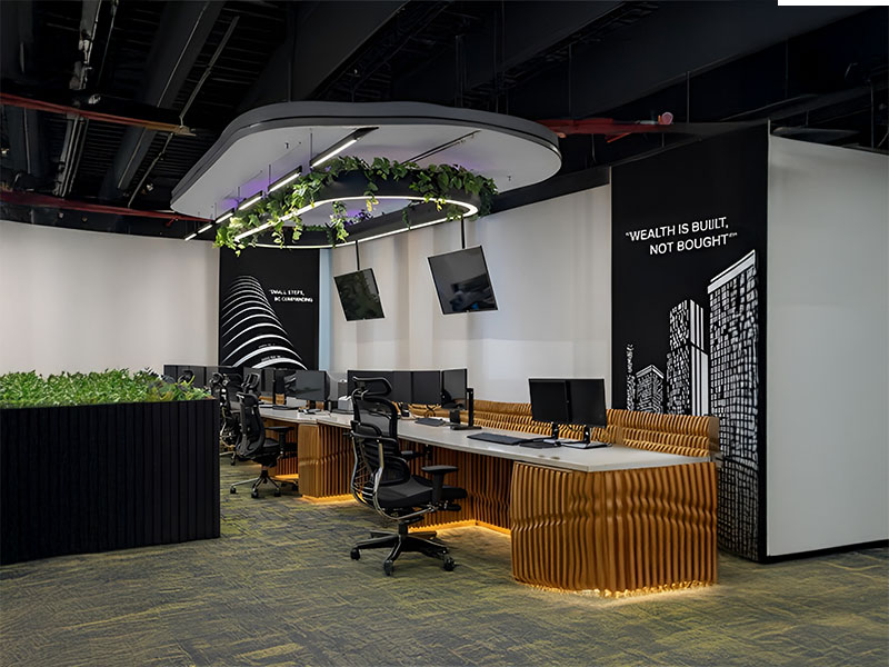 Parabolic and ergonomically designed standing tables, offering a more dynamic working environment with biophillic elements, such as mini indoor planters and organic materials, integrated seamlessly.